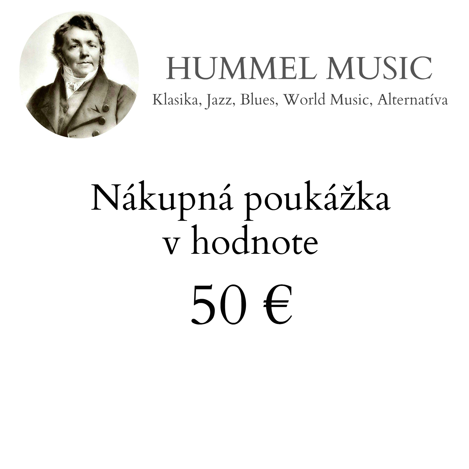Chcete darovať peknú hudbu, ale neviete vybrať? Stačí darovať darčekovú nákupnú poukážku vo vami zvolenej hodnote. Nákupnou poukážkou môžete nakupovať v našej predajni HUMMEL MUSIC, Klobučnícka 2, 811 02 Bratislava. Ak si želáte pridať špeciálny text na poukážku, napr. s venovaním, uveďte ho pri objednávke. Poukážky majú platnosť vždy do konca kalendárneho roku v ktorom boli vydané (ak si želáte predĺžiť platnosť poukážky, uveďte to pri objednávke).